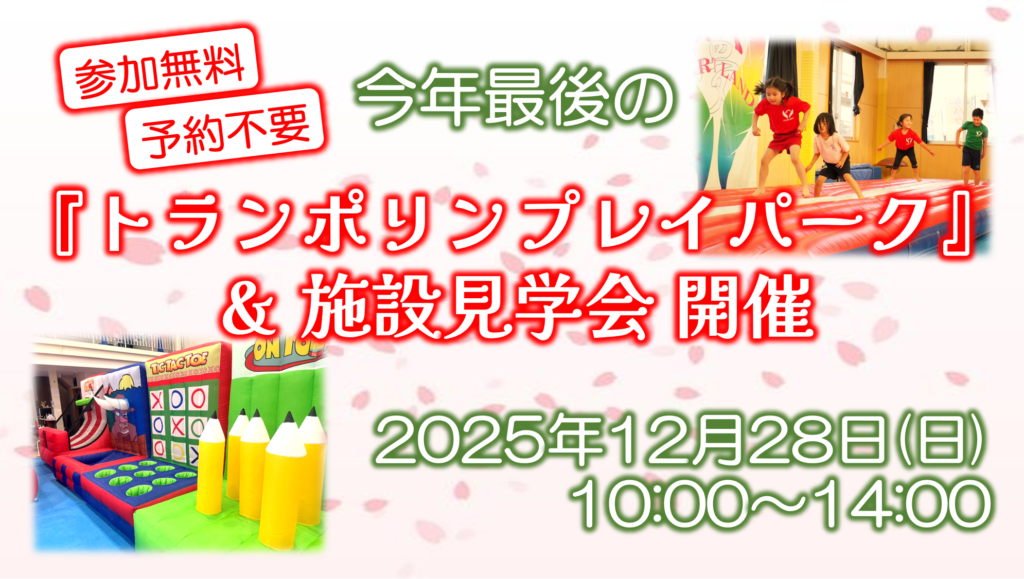 12月28日(日)、『トランポリン プレイパーク』を開催します! 新規のお客様、すでに会員の方、どなたでもご入場できます。 はじめてご来場の方には、施設の説明もおこないますので、遠慮なくスタッフまでお声かけくださいね。 詳しくはこちら!