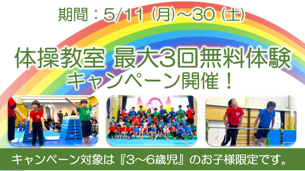 5月11日(月)~30日(土) 『体操教室3回無料体験キャンペーン』 実施します!