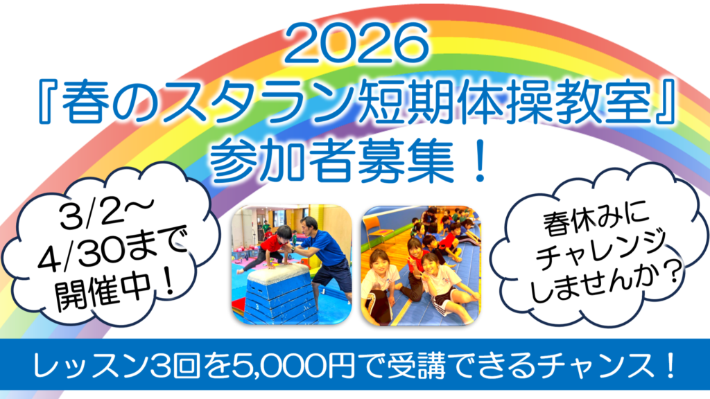 はじめてのお子様を大歓迎! 会員の方も体操教室を体験できるチャンス! 春休みに、スタートランドで体操教室を体験してみたい! 鉄棒や跳び箱、マット運動やトランポリンを集中的に練習したい! 参加料のみ!入会金不要で参加できる期間限定の短期体操教室です!
