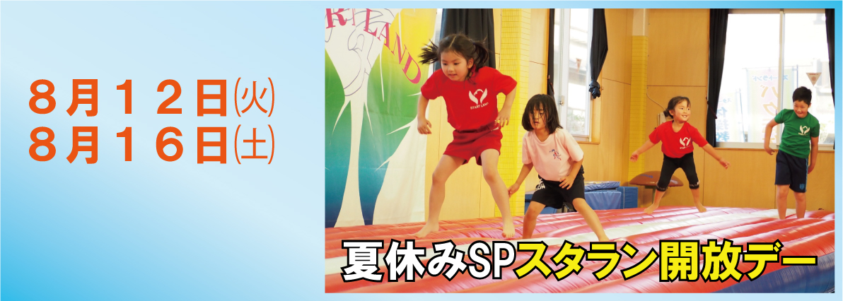 当日は冷房完備のスタートランドの広い施設で楽しく遊ぶ他、マット運動、跳び箱、トランポリンジャンプトレーニング他ミニレッスンも予定しております!!